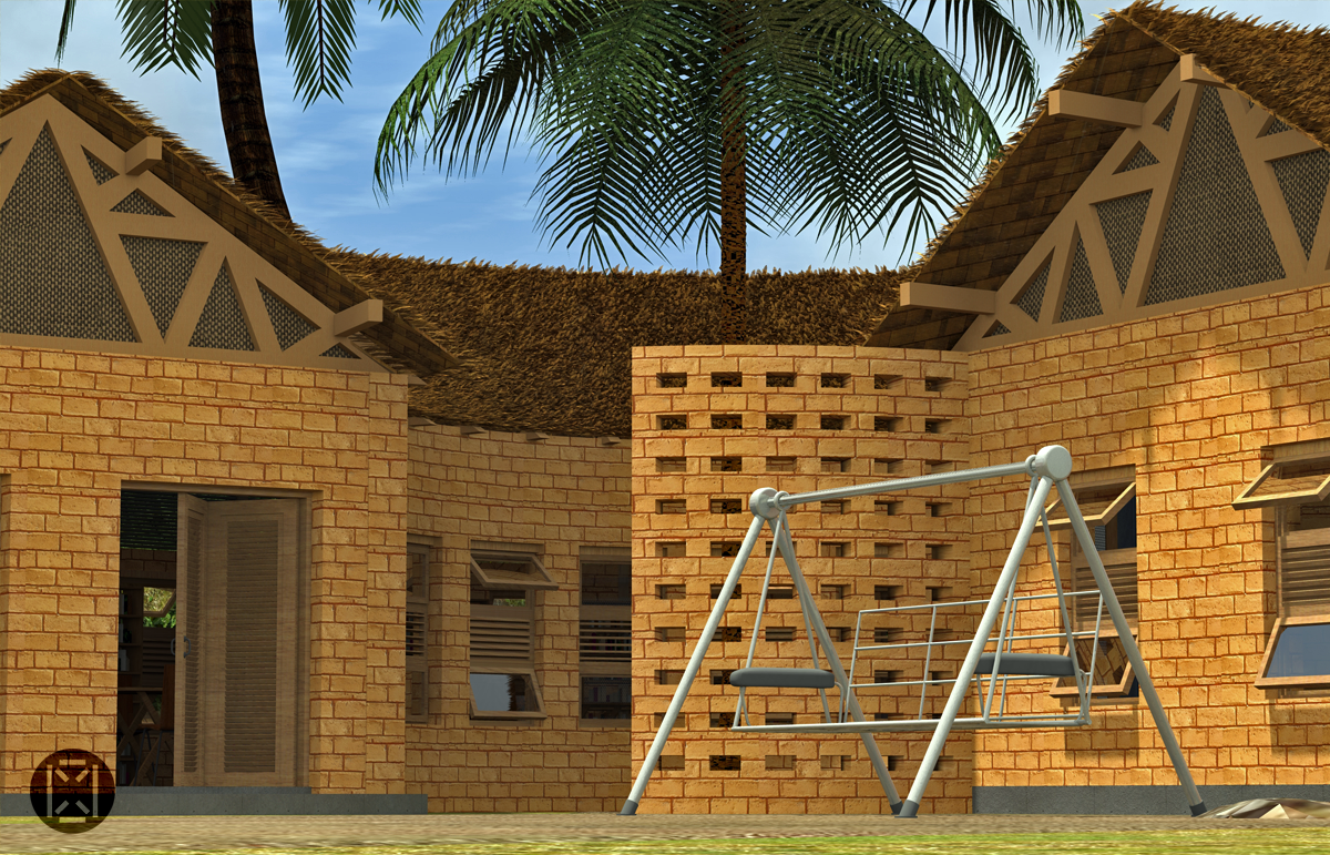 Built with locally produced bricks, the structure has a hybrid top with a tin thatched roof for reasons both aesthetic and climate. The thatched roof serves assimilation with his most immediate surroundings.