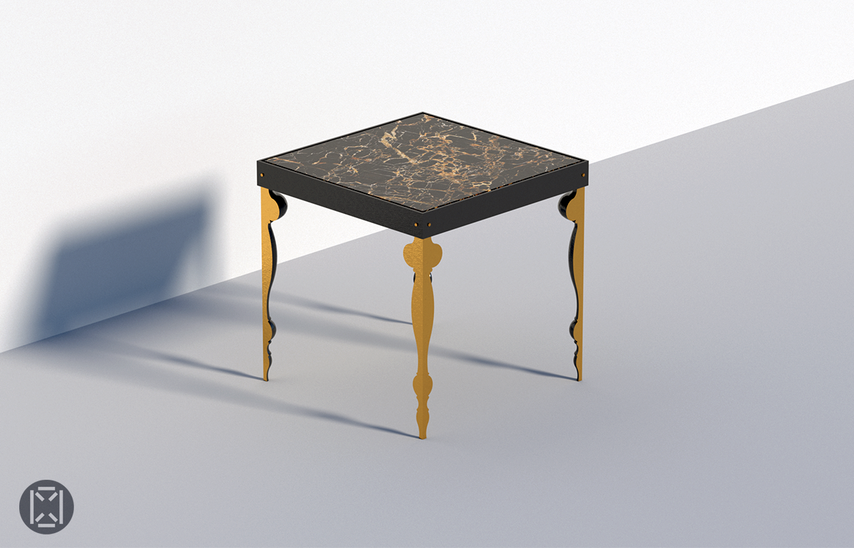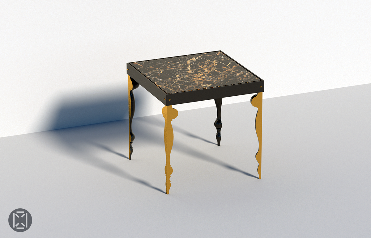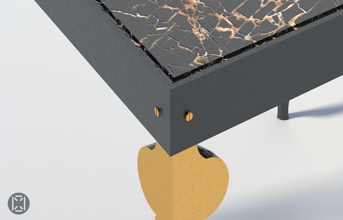 Twisted outward, the four new legs are capped by a band made of four steel parts forming a square stripe coated in matte black; all assembled with screws on each corners. The frame offers the structural support for the heavy black and gold marble top that completes the design.