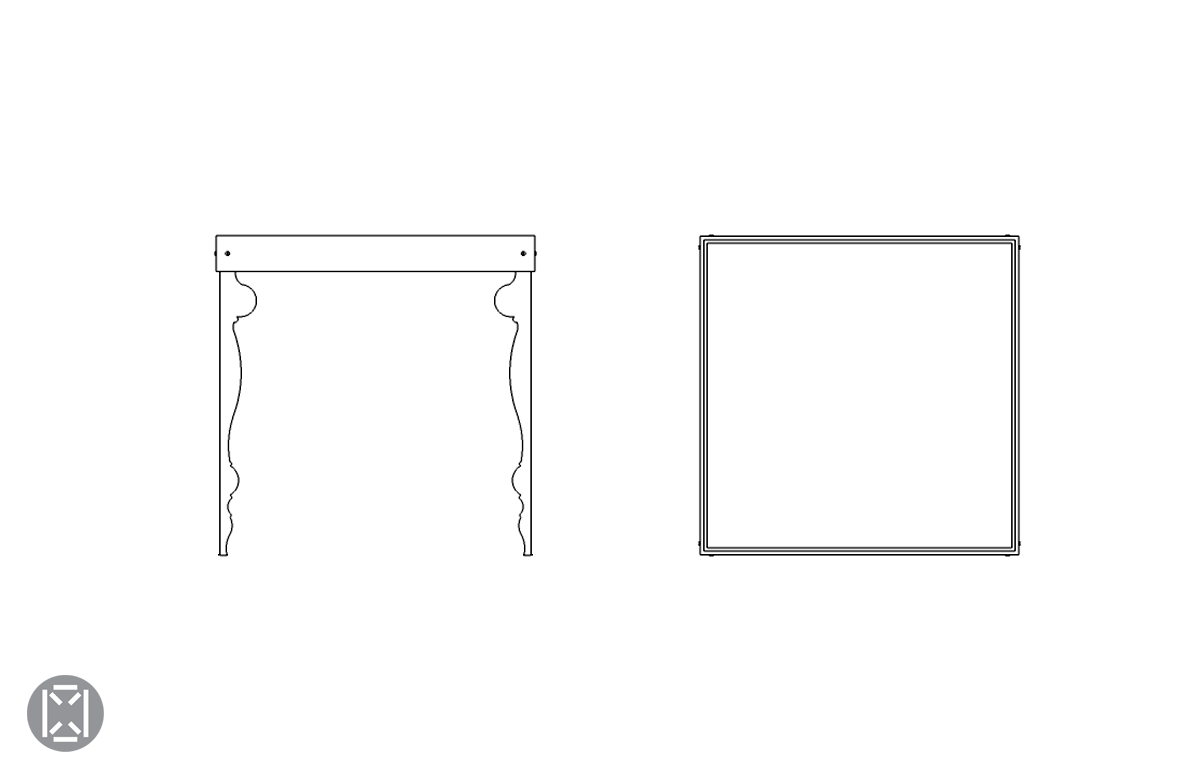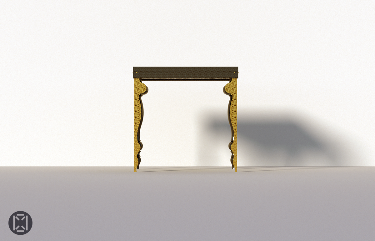 Tordues vers l'extérieur, les quatre nouvelles jambes sont coiffées d'une bande faite de quatre parties en acier formant une bande carrée enduite de noir mat; tous assemblés avec des vis à chaque coin. Le cadre offre le support structurel pour le haut en marbre noir et or qui complète le design.
