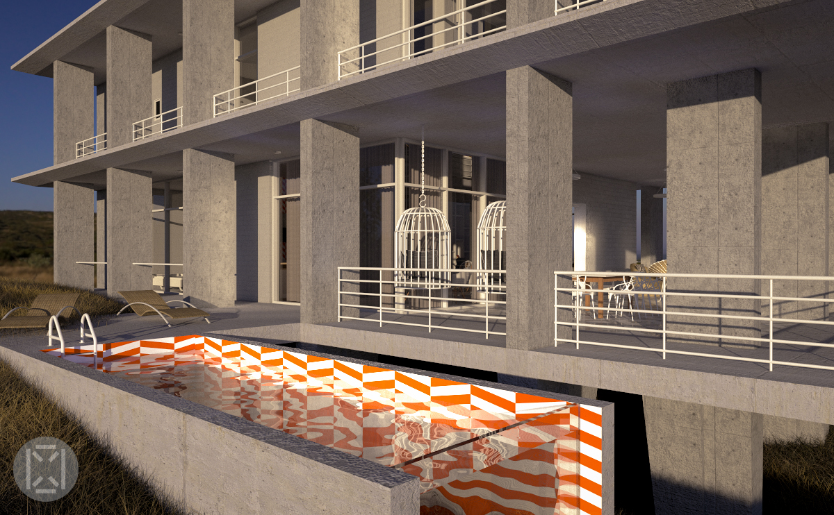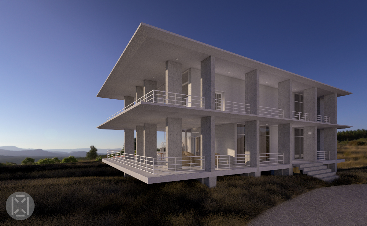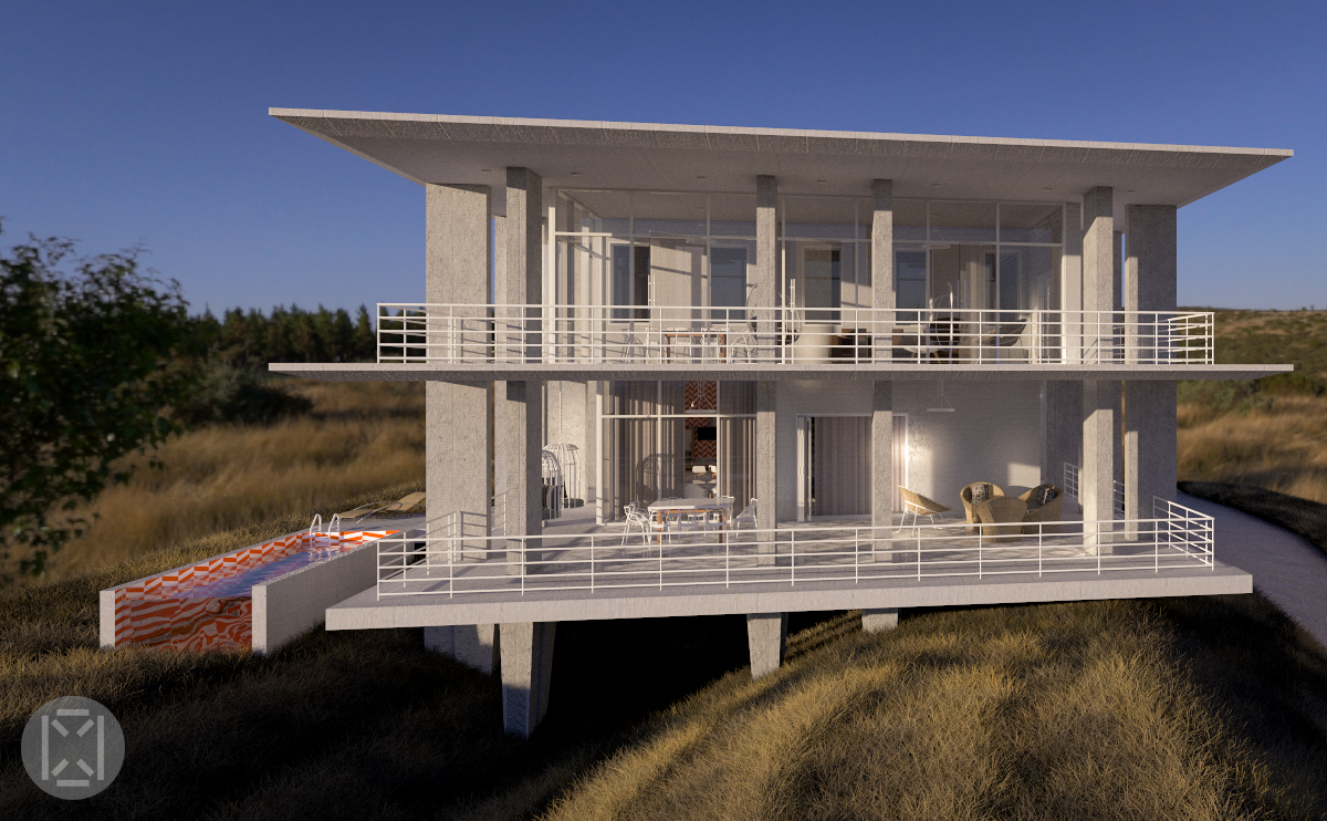 Dix-huit colonnes rectangulaires placées sur des plinthes de forme dynamique totalisent 6m2 au sol plus le 12m2 de la piscine rendant ainsi l'impact global du bâtiment sur le site inférieur aux 20m2 alloués aux cabines de vacances dans la région tout en offrant 600m2 d'espace habitable pour accueillir le programme pour les fonctions requises de toute la famille.