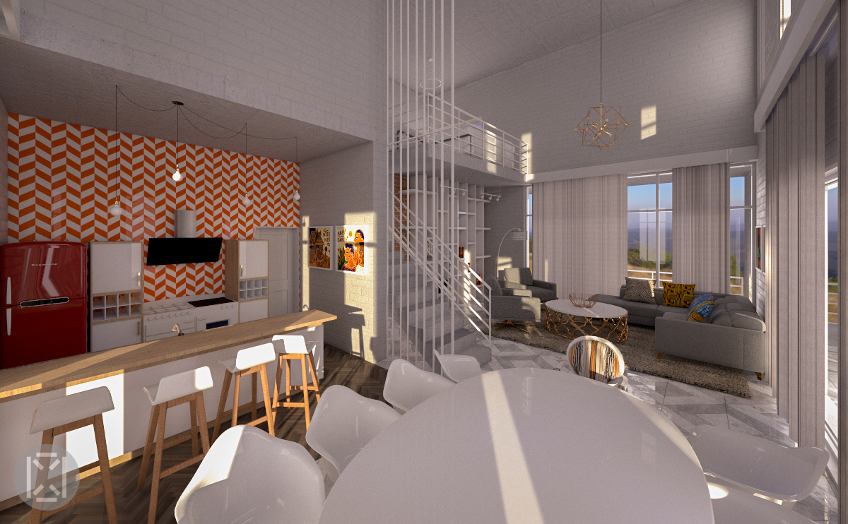 The driveway leaving to the farm in the valley is greeted by a 5-step concrete staircase leading to the elevated ground floor plate with its large balcony overlooking the scenic wonder of the “Panorama Route” made of seven town (Lydenburg, Sabie, Graskop, Pilgirm’s Rest, Hazyview, Ohrigstad and Kiepersol), all offering several cultural and natural points of interest, like the Blyde River Canyon, the world’s third largest canyon featuring numerous waterfalls. To keep the structure of the house light in the core, the ground floor open to an open plan double-volume living area with a lounge, a dining area and a kitchen with its scullery, two bedrooms with en-suite bathrooms. The staircase in the heart of the house leads to the second floor containing an elevated TV room, 2 bedrooms and a full bathroom. The floor also opens to a weather sensitive glaze-enclosed lounge and its large balcony also offering 270° views of the glorious landscape, a point from which the farm below can be monitored.