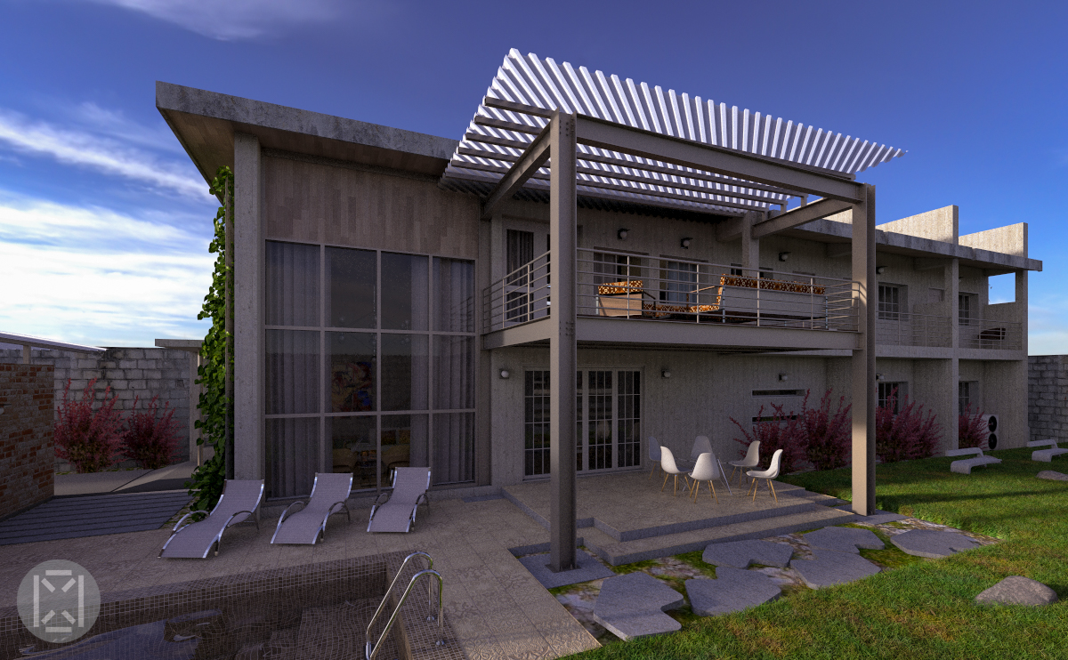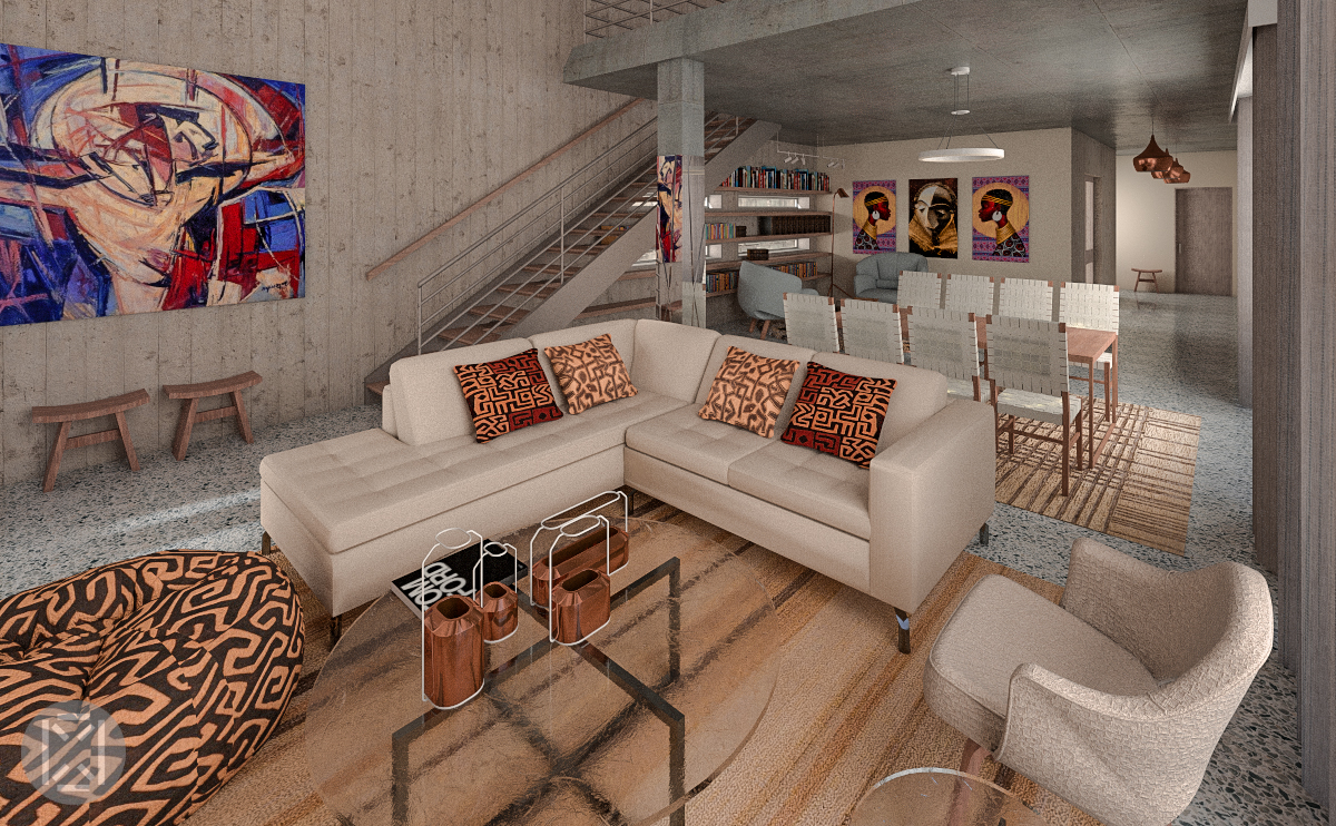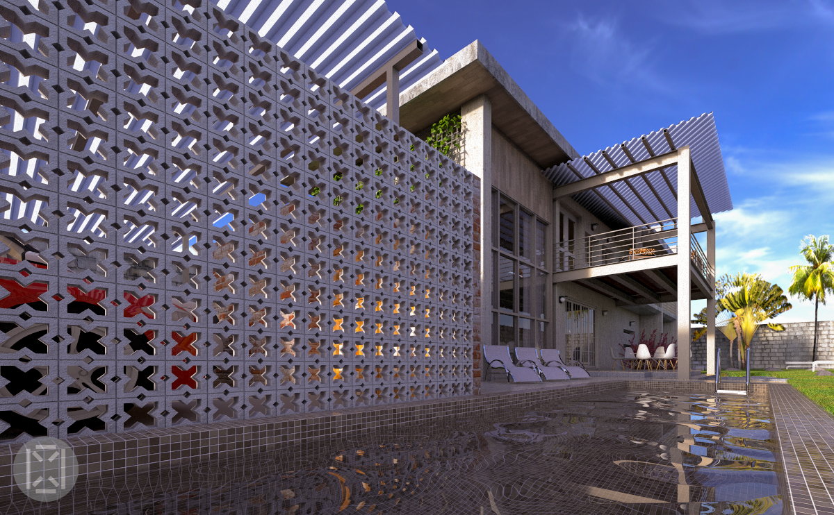 L’ensemble de la façade Sud du salon est vitré pour baigner les espaces clos avec la lumière naturelle dans une ville où l’électricité n’est pas garantie chaque jour du matin au soir et pour maximiser l’ombre naturelle du Sud, loin du dur soleil tropical du Nord.